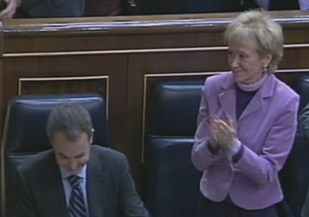 La vicepresidenta en funciones, María Teresa Fernández de la Vega, se mostró satisfecha tras escuchar al candidato a la presidencia, José Luis Rodríguez Zapatero.