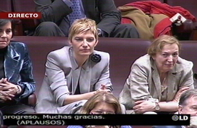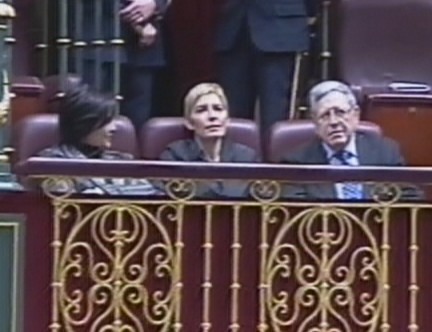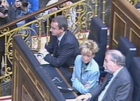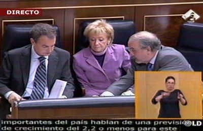 Chacón y Narbona prestan atención al discurso. Encima, Soraya Sáenz de Santamaría junto a Acebes y Rajoy escuchan la réplica de Zapatero a la intervención de Rajoy. (Imagen LDTV)