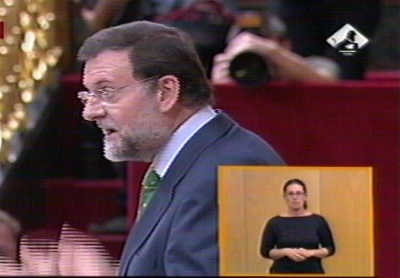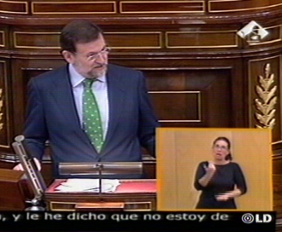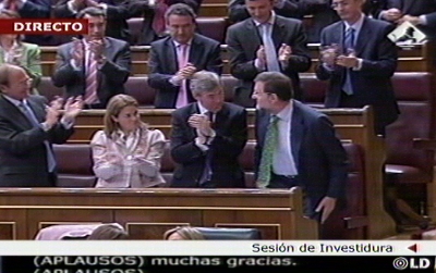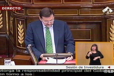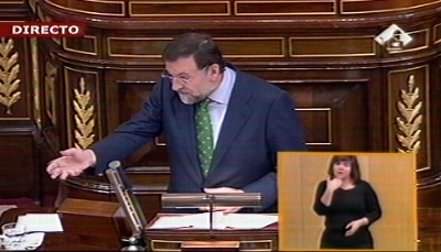 En su intervención, Rajoy fijó la posición de su grupo "que han respaldado diez millones de españoles" durante la próxima legislatura. En líneas generales recordó que Zapatero suele "prometer una cosa para hacer la contraria" y "se guarda cosas que va a hacer y prefiere no anunciarlo. Además, en el primer minuto de intervención dejó claro que el PP votaría en contra de la investidura de Zapatero. (Imagen LDTV)