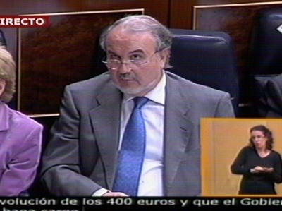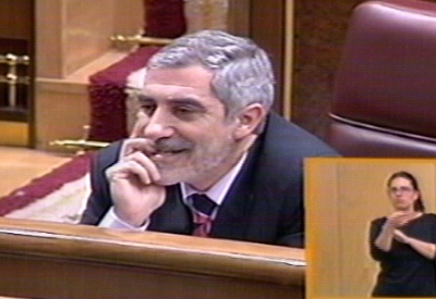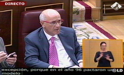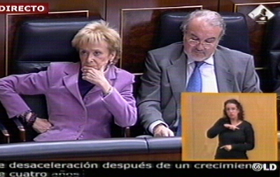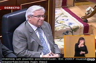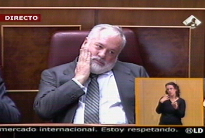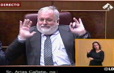De nuevo, Arias Cañete. Esta vez, muy gráficamente, hace gestos a Zapatero censurando su optimismo económico. (Imagen LDTV)