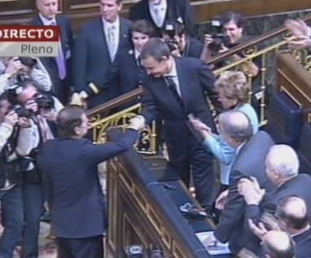 Mariano Rajoy felicita a José Luis Rodríguez Zapatero tras haber sido reelegido presidente del Gobierno con los únicos apoyos de los diputados del Partido Socialista.