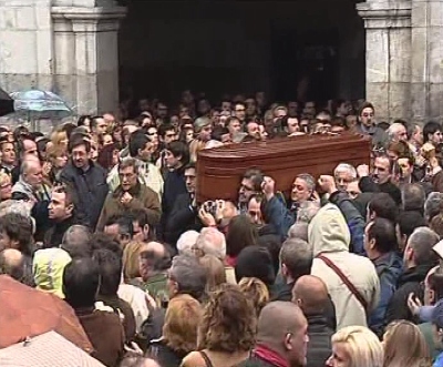 La viuda y las hijas del fallecido así como numerosos familiares y amigos de Isaías Carrasco despiden en Mondragón al ex edil del PSE asesinado por ETA.
