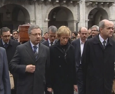 La vicepresidenta primera del Gobierno, María Teresa Fernández de la Vega (c), el presidente y el secretario de Organización del PSOE, Manuel Chaves (d) y José Blanco (i), y el secretario de Estado de Seguridad, Antonio Camacho (c-detrás), anteceden a los dirigentes de los socialistas vascos que portan el féretro del ex concejal de su partido. (LDTV)