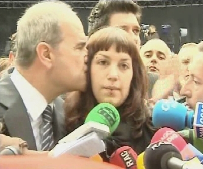 Tras 15 minutos de absoluto silencio en memoria de Carrasco, Sandra recordó a su padre. El presidente del PSOE en Andalucía, Manuel Chaves (i), besa a la hija de Isaías Carrasco. (LDTV)
