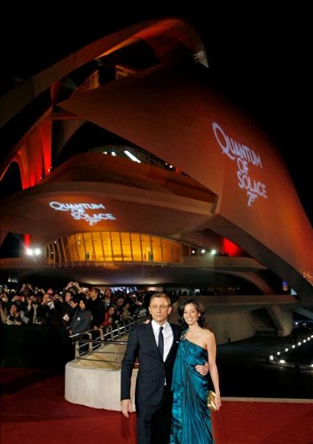 El actor británico Daniel Craig posa junto a su esposa ante el Palau de Les Arts donde se ha estrenado en España la última entrega de la saga de James Bond: "Quantum of Solace". (EFE)