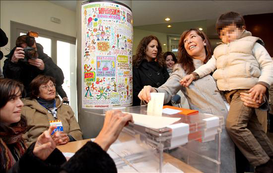 La candidata del PP a la Generalidad, Alicia Sánchez-Camacho, con su hijo en brazos, emite su voto este domingo en un colegio electoral del barrio del eixample barcelonés en las elecciones autonómicas que se celebran hoy en Cataluña