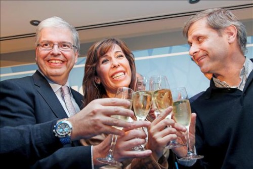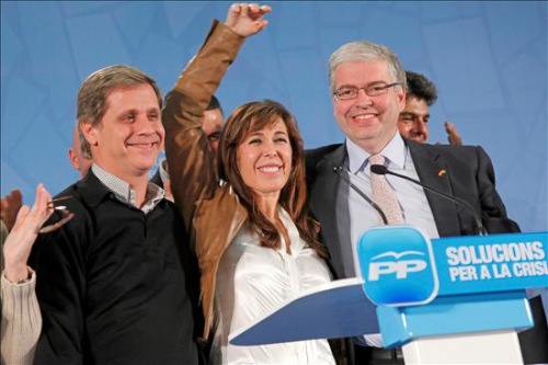 La candidata del PPC, Alícia Sánchez-Camacho (c), brinda con el presidente del grupo del PP en el Ayuntamiento de Barcelona, Alberto Fernández Díaz (d), y el secretario general del PP catalán, Jordi Cornet, brindan con cava tras conocer los 18 escaños logrados por su partido.