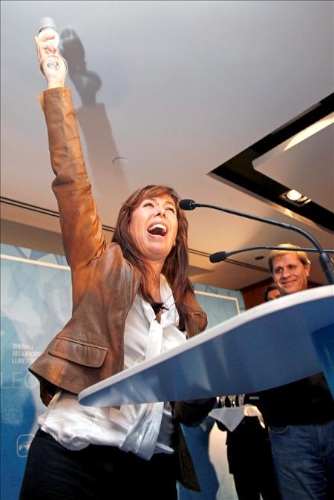 La candidata del PPC, Alícia Sánchez-Camacho, brinda con cava durante la comparecencia ante la prensa celebrada esta noche en Barcelona.