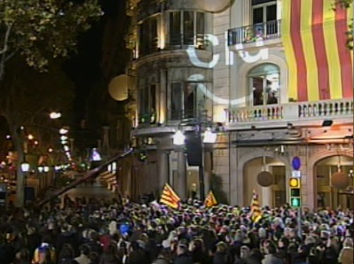 Centenares de personas aplauden frente al Hotel Majestic de Barcelona los resultados electorales de CiU, ganadora en los comicios catalanes.