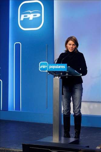 La secretaria general del Partido Popular, María Dolores de Cospedal, durante la conferencia de prensa en la sede de su partido en Madrid, en la que ha destacado que los resultados provisionales certificarían el fracaso del proyecto del tripartito.