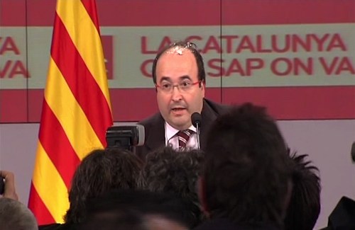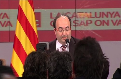 El portavoz del partido y número 5 por Barcelona, Miquel Iceta, recibió un huevazo en la frente mientras comparecería ante los medios para valorar los primeros datos a pie de urna.