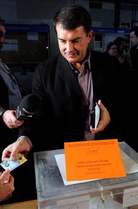 El candidato de Solidaridad Catalana para la Independencia ( SI ) a la Generalidad, Joan Laporta, muestra su DNI para ejercer su derecho al voto en la Facultad de Derecho de la Avenida de Pedralbés, en las elecciones autonómicas que se celebran en Catalauña, donde ha hecho un llamamiento a la participación en las elecciones catalanas y ha afirmado que hoy puede darse un "primer paso" hacia la constitución de "un Estado catalán dentro de la Unión Europea"