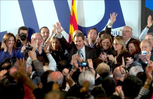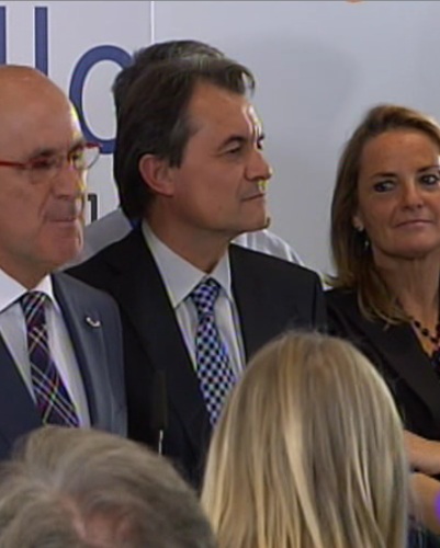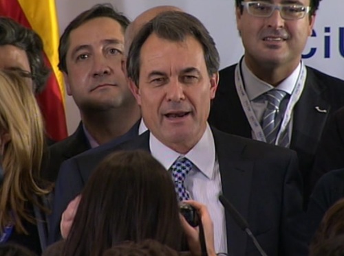 El lider de CiU, rodeado de miembros de su formación, se dirige a sus simpatizantes tras vencer en las elecciones autonómicas catalanas.