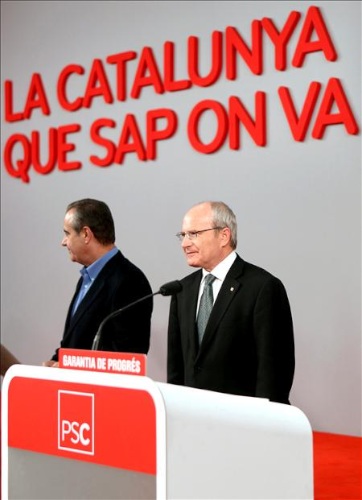 El candidato del PSC a las elecciones autonómicas catalanas, José Montilla, acompañado de Celestino Corbacho (i), durante su comparecencia.