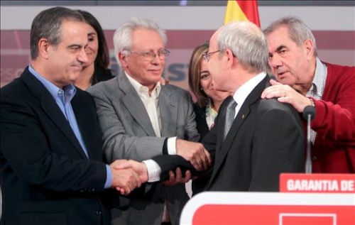 José Montilla (2d), es acompañado y apoyado por su candidato número tres en Barcelona, Celestino Corbacho (i); el vicepresidente del Senado Isidre Molas (2i); la ministra de Defensa, Carme Chacón (c) y el consejero de Educación Ernest Maragall (d), durante su comparecencia en la sede del partido.