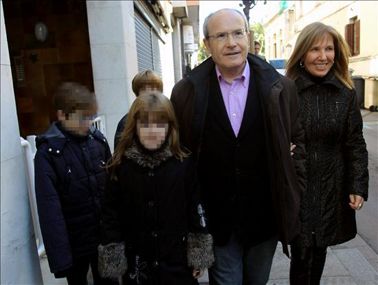 El candidato de CiU, Artur Mas, junto a su mujer, Helena Rakosnik (d), el secretario general Josep Antoni Duran Lleida (2-i), y el expresidente de la Generalidad, Jordi Pujol (i).