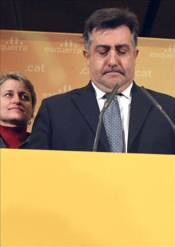 Joan Puigcercós, acompañado por la diputada Anna Simo, durante la rueda de prensa en Barcelona para la bajada en los resultados de ERC.
