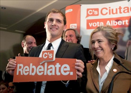 El candidato de C's, Albert Rivera (i), durante la rueda de prensa que ha ofrecido en el Hotel Gallery de Barcelona para valorar los resultados de las elecciones catalanas en general y los obtenidos por su formación.