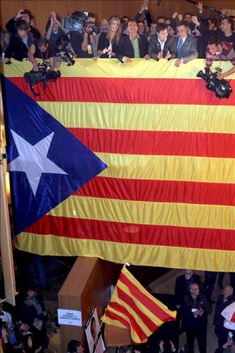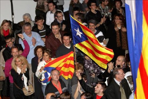 Los seguidores y militantes de Solidaritat Catalana celebran los resultados obtenidos en las elecciones catalanas. Con un 95,09 por ciento de los votos escrutados, se estima que los resultados de la formación de Laporta llegarían a los cuatro diputados.