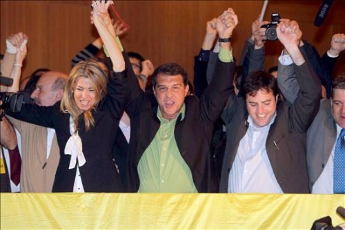 El candidato a la presidencia Joan Laporta, acompañado por Anna Arqué y Uriel Beltrán, celebran los resultados de su formación.