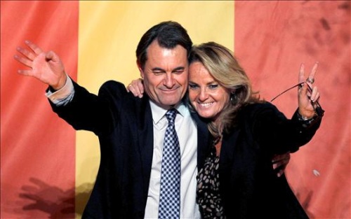 El candidato de CiU, Artur Mas, junto a su mujer, Helena Rakosnik, saludan a sus simpatizantes desde el balcón de un céntrico hotel de Barcelona, tras vencer en las elecciones autonómicas catalanas.