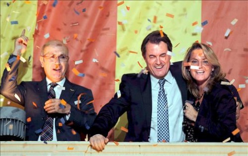 El candidato de CiU, Artur Mas, junto a su mujer, Helena Rakosnik (d), y el secretario general Josep Antoni Duran Lleida (i), en el balcón de un céntrico hotel de Barcelona tras vencer en las elecciones autonómicas catalanas.