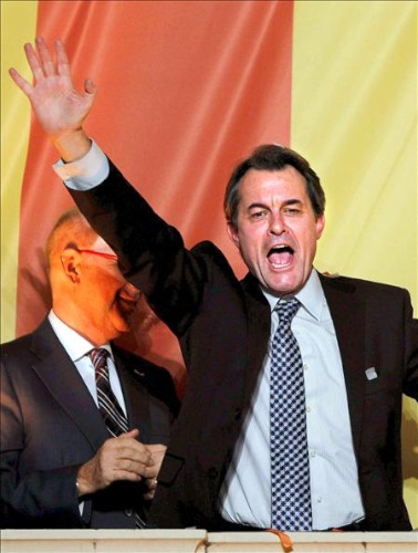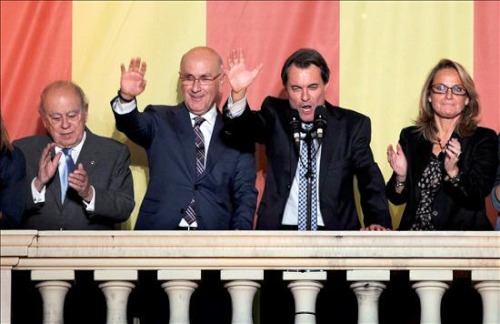 El candidato de CiU, Artur Mas, saluda desde el balcón del hotel Majestic en Barcelona junto al diputado Durán, poco después de conocerse los resultados definitivos de los comicios.