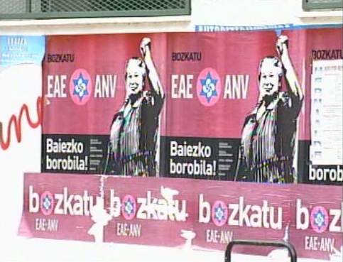 Carteles pidiendo el voto para ANV, la nueva franquicia electoral de ETA, junto al consistorio de Lizarza.