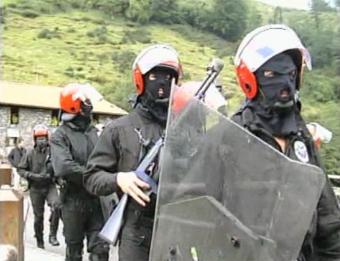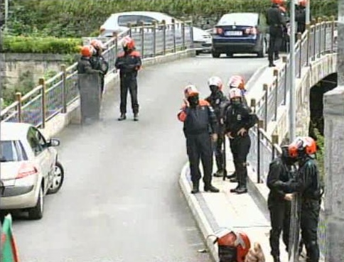 Efectivos de los "Beltzas" y de la "Brigada Móvil" de la Ertzaintza controlan el acceso al puente que divide Lizarza en dos partes.