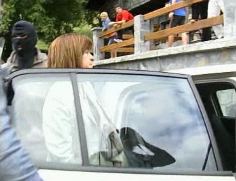 Momento en el que Regina Otaola entra en su coche de sus escoltas para abandonar Lizarza.