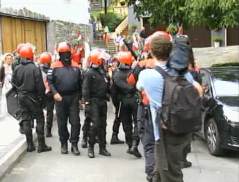 Agentes de la Ertzaintza controlan a varios de los proetarras que salieron este sábado a las calles de Lizarza.