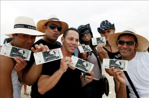 Varios jóvenes muestran sus entradas para el concierto que la cantante Madonna ofreció en Valencia.(EFE)
