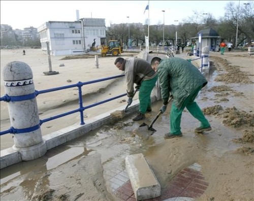 Empleados municipales retiran la arena que un golpe de mar arrojó sobre la carretera en el Sardinero debido al fuerte temporal que azota la costa del Cántabrico. (EFE)