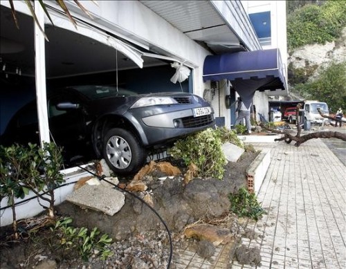 Un coche arrastrado por un golpe de mar permanece empotrado en el interior del comedor de un hotel en el Sardinero, debido al fuerte temporal que azota la costa del Cantábrico. (EFE)