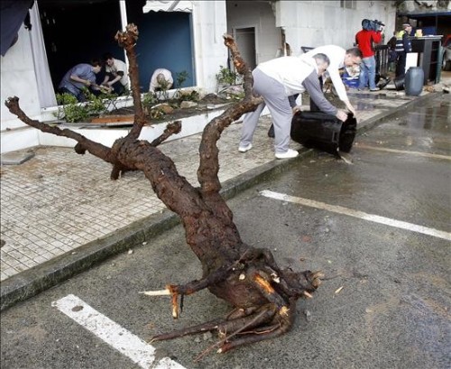 Un tamarindo arrancado por un fuerte golpe de mar en el Sardinero permanece en la calle mientras los empleados de un hotel sacan el agua que inundó parte de sus instalaciones debido al fuerte temporal que azota la costa del Cántabrico. (EFE)