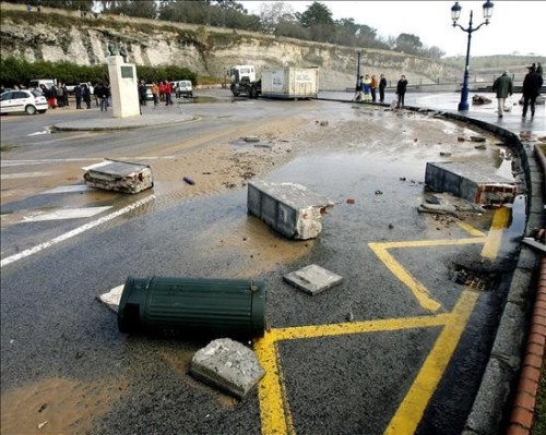 Restos de un muro derribado por un fuerte golpe de mar en el Sardinero debido al fuerte temporal que azota la costa del Cantábrico. (EFE)