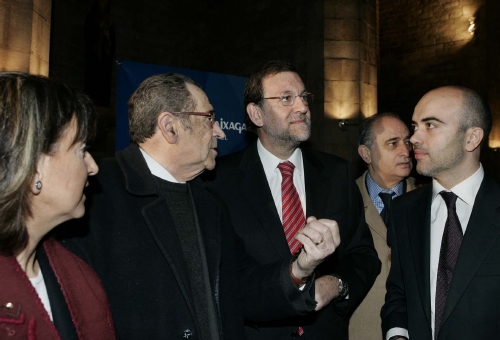 El presidente del PP, Mariano Rajoy (c.), en unas jornadas sobre fiscalidad celebradas en Barcelona. (LD)
