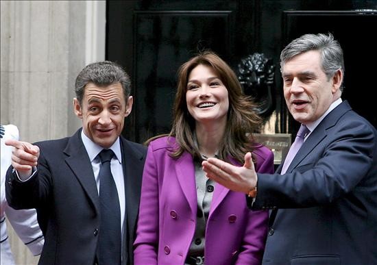 La primera dama en medio del presidente francés, su esposo, y el primer ministro británico, Gordon Brown, posan este jueves por la mañana en la puerta de la residencia del premier en el nº10 de Downing Street. La atención del premier británico con la primera dama francesa ha dado rienda suelta a la imaginación y humor de los tabloides británicos.