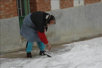 Una vecina de Cella (Teruel) rasca con una espátula el hielo que hay en la entrada de su casa que se ha formado por las bajas temperaturas.EFE
