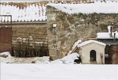 Un grupo de corderos permanecen en un redil rodeados de la nieve caída la localidad navarra de Ujue. EFE