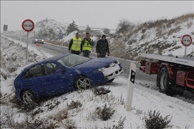 Una grúa saca de la cuneta un turismo caído, tras la fuerte nevada en la carretera N-330 (Huesca), donde se ha necesitado el uso de cadenas durante toda la mañana. EFE