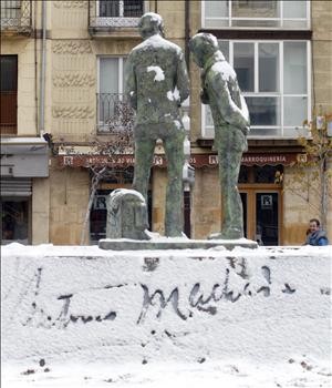 La nieve se ha presentado en la capital soriana. En la foto, el monumento en homenaje al poeta Antonio Machado, con motivo del Centenario de su llegada a Soria. EFE