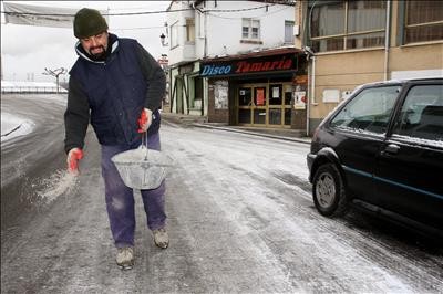 El frío intenso ha congelado la nieve caída en el norte de la provincia de Palencia. En la foto, un vecino de Velilla del Rio Carrión arroja sal en la carretera que cruza el municipio. EFE
