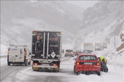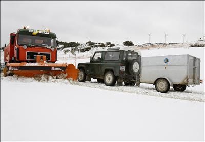 Un camión quitanieves despeja la NA-5310 que permanecía cerrada desde primeras horas tras la nevada caída. EFE