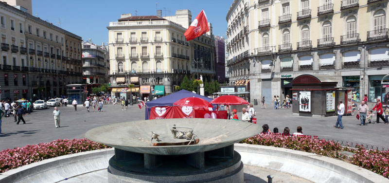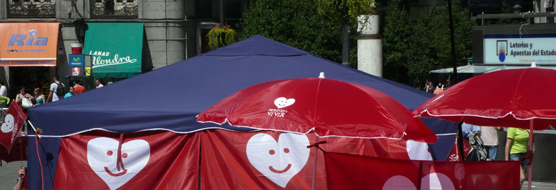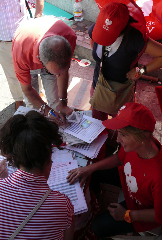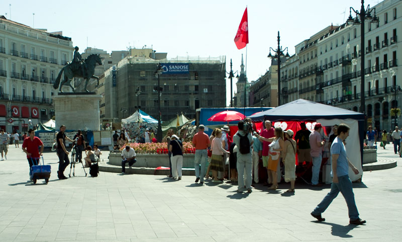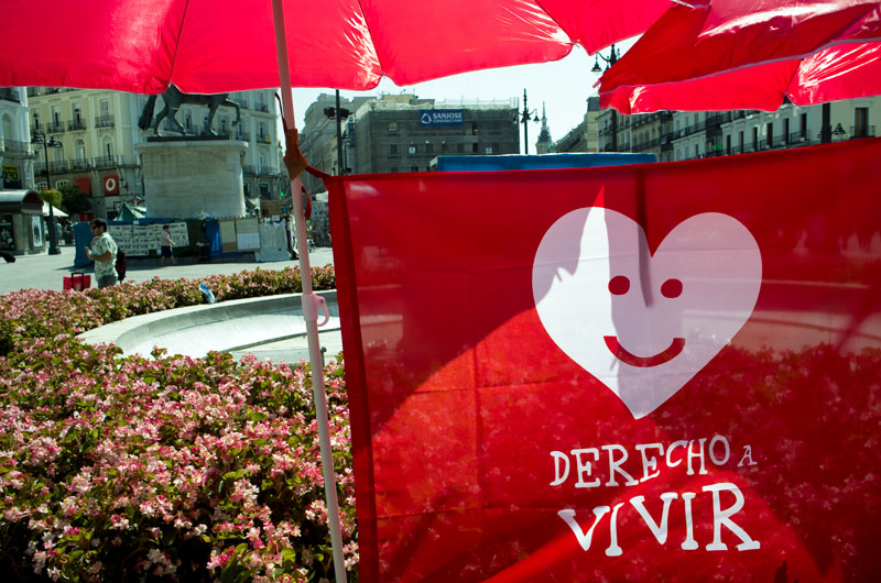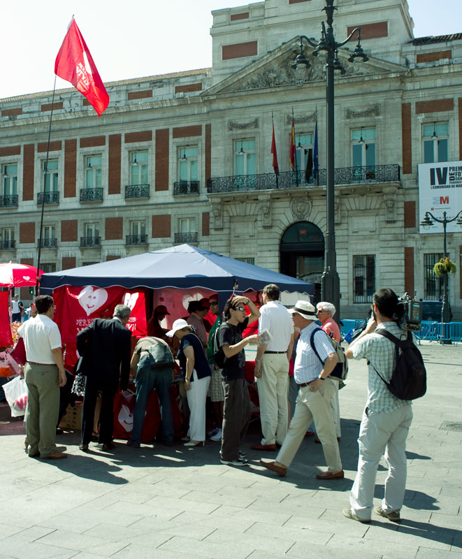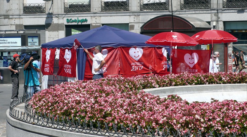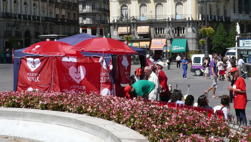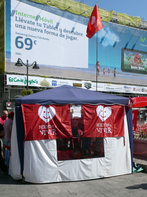 El puesto se encuentra al final de la calle Preciados. Los participantes han colocado una bandera de Derecho a Vivir.
