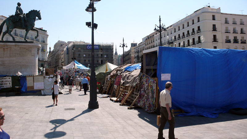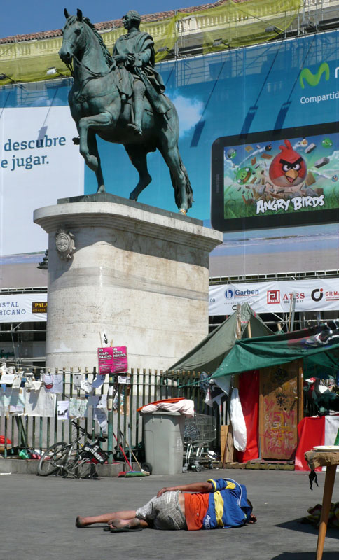 Pasadas las doce de la mañana un 'indignado' duerme a pierna suelta y a pleno sol en plena plaza.