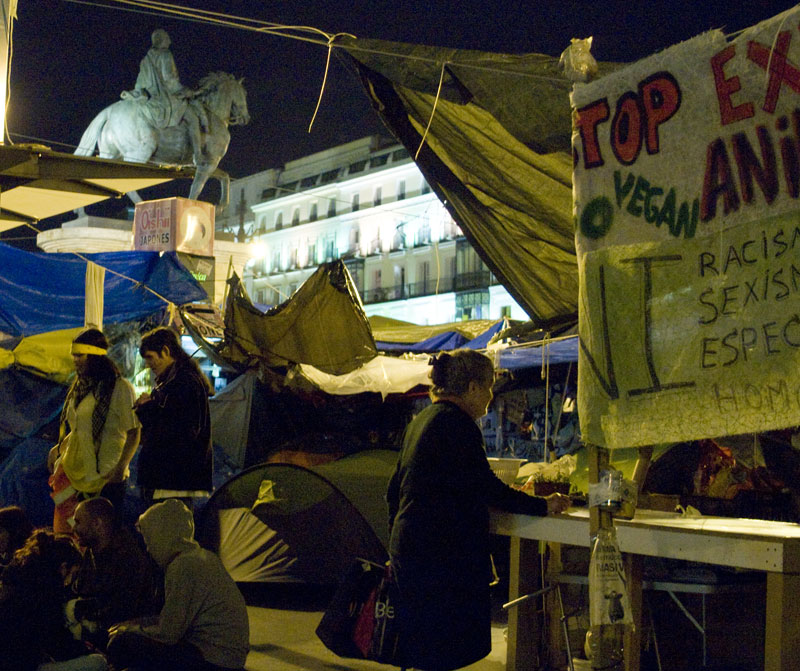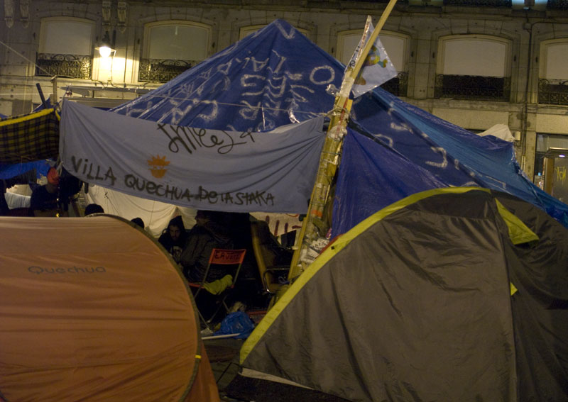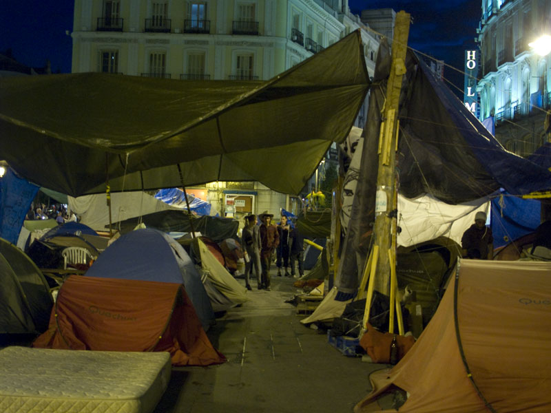 El ensanche de Preciados y el de Arenal han quedado unidos. Entre medias esta calle flanqueada por tiendas de campaña con su preceptivo colchón.