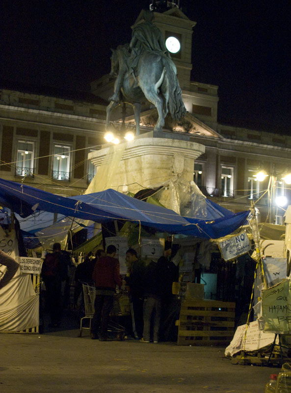 Cae la noche sobre la Puerta del Sol. Uno de los participantes en la asamblea sigue una de las intervenciones recostado sobre la marquesina de la estación de Cercanías.