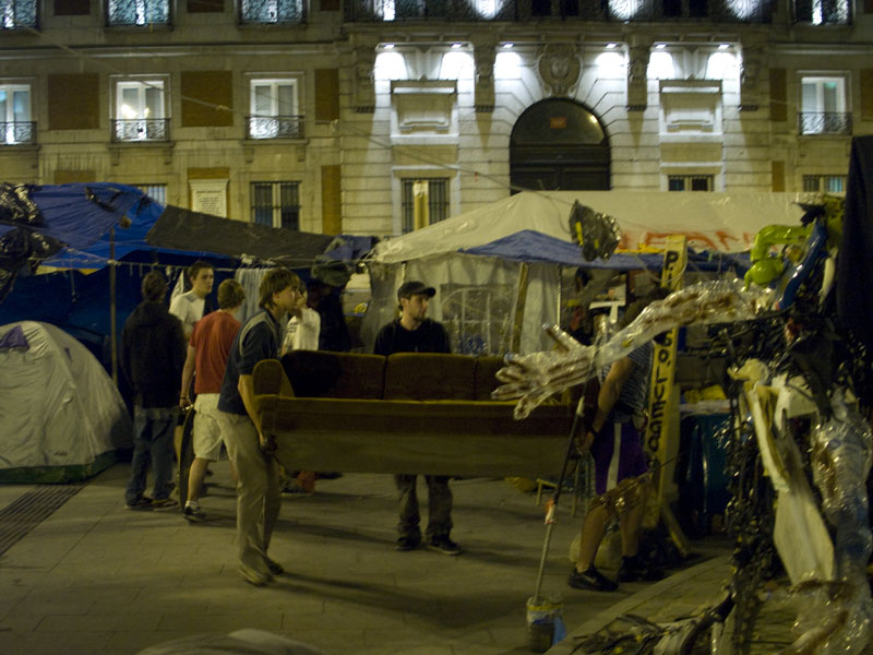 Dos acampados acarrean uno de los muchos sofas que hay en la plaza. Probablemente alguien lo vaya a utilizar esa noche para dormir en él.