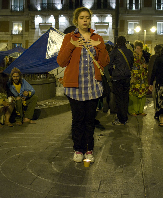 Una joven en trance hace unos ejercicios espirituales sobre una espiral pintada sobre el suelo en cuyo centro han colocado una vela.